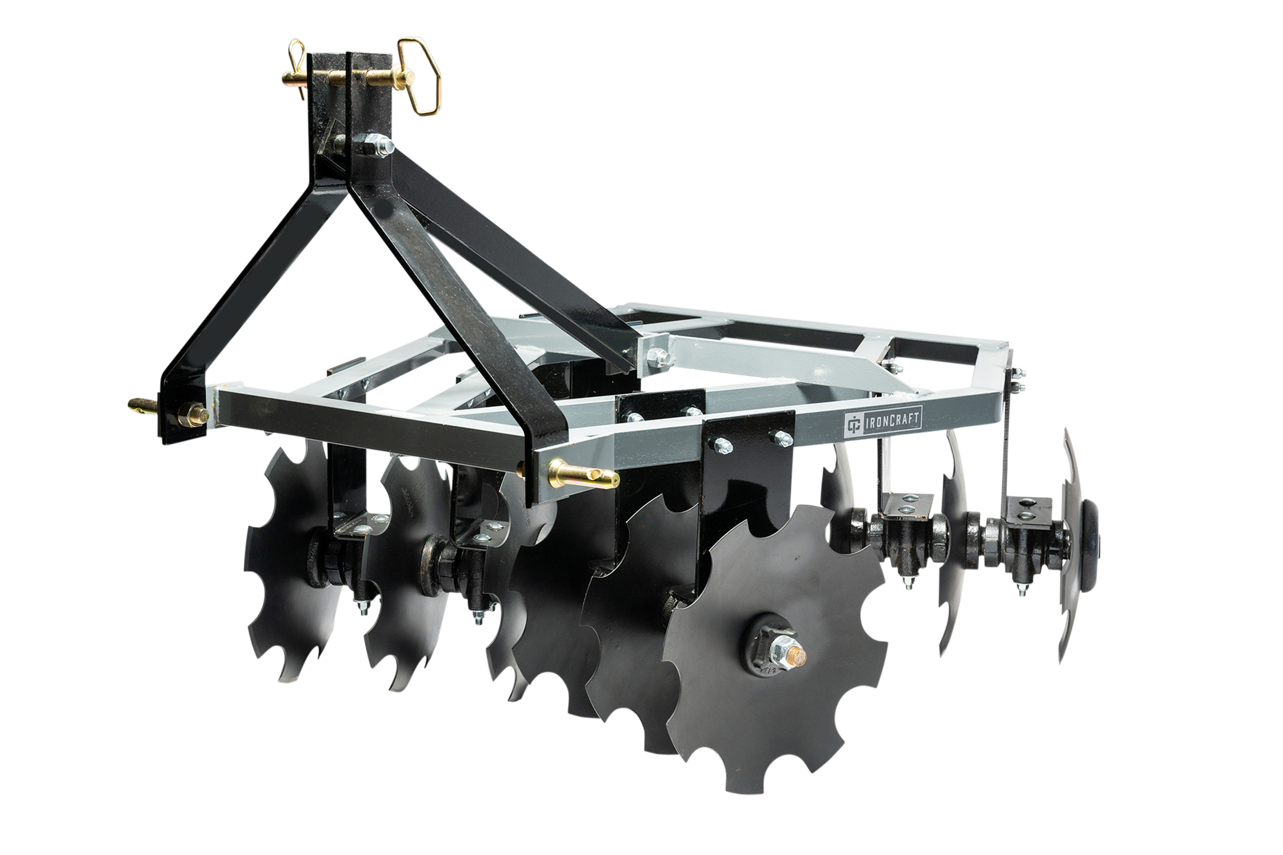 These Angle Frame Disc Harrows are our basic disc harrow, best suited for residential landscaping, small gardens, nurseries, hobby farms, and wild game food plots. They are designed to open and break up the soil surface for prepping seedbeds for planting. They are available in 48” and 60” cutting widths. They feature notched discs which easily break up and redistribute cultivated topsoil, and are designed for a Category I quick hitch. We offer two different models designed for tractors ranging from 20 to 40 hp.